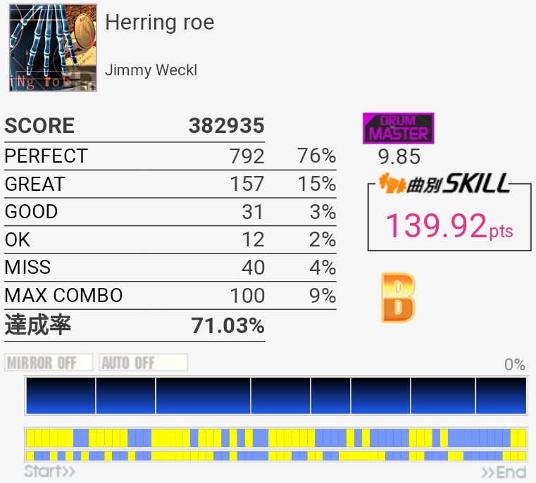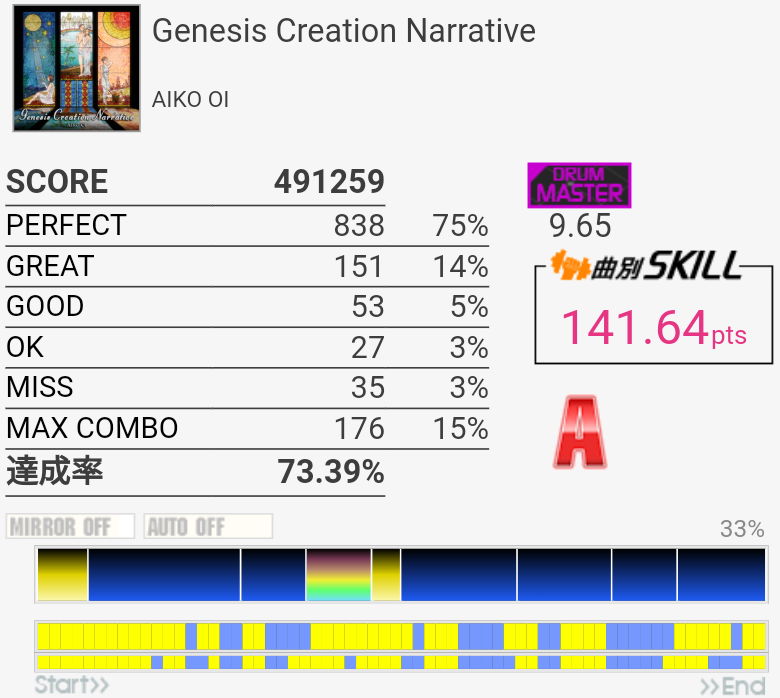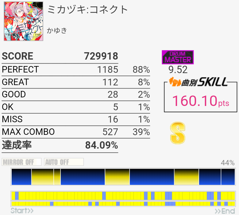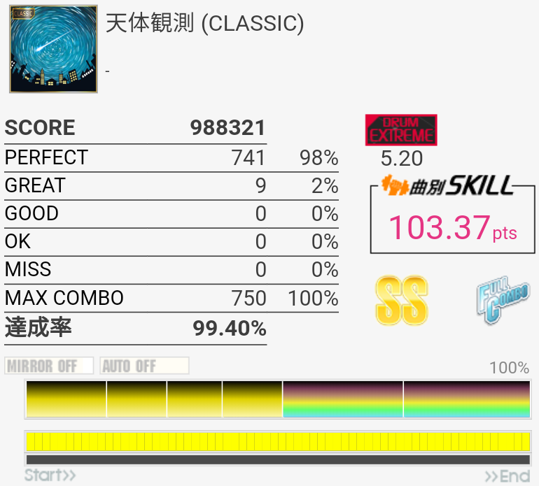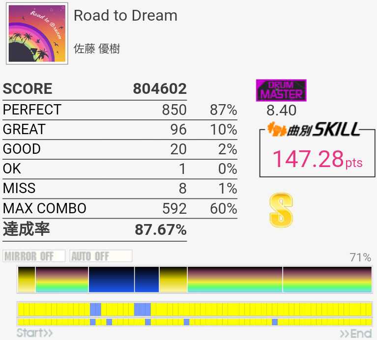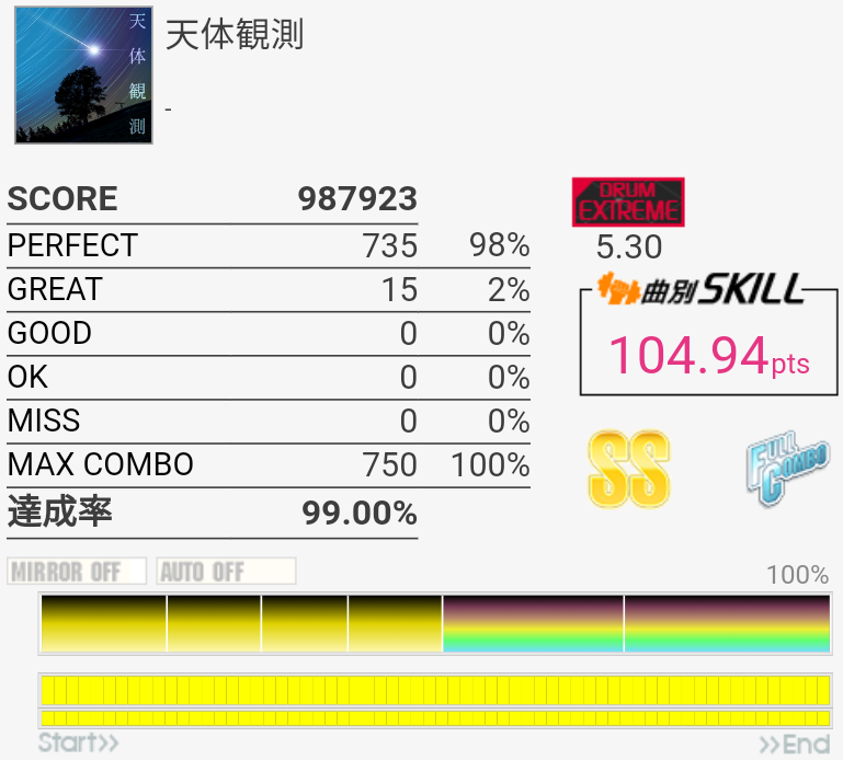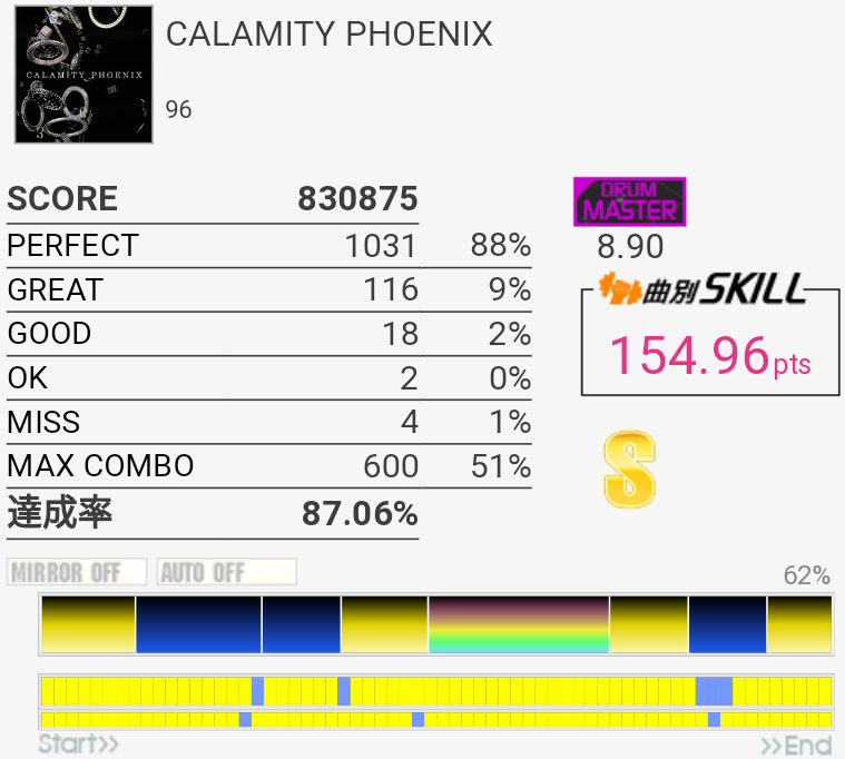 確認の成果があったのかちょっと伸びた。でも4フレーズ目は全然叩けない、考えて手が動かなくなっちゃうやつ。相変わらずパフェ率も低い。