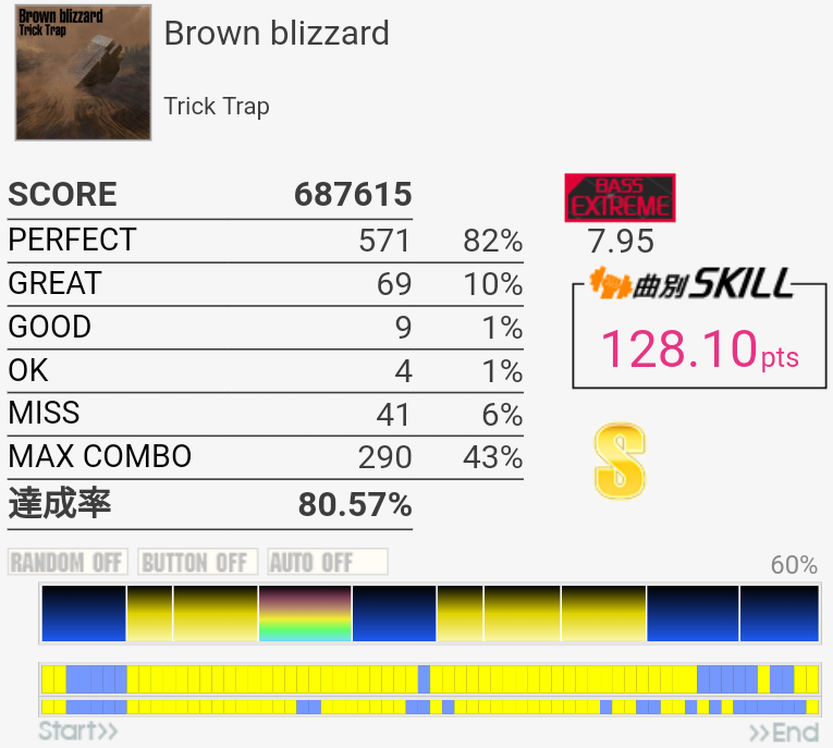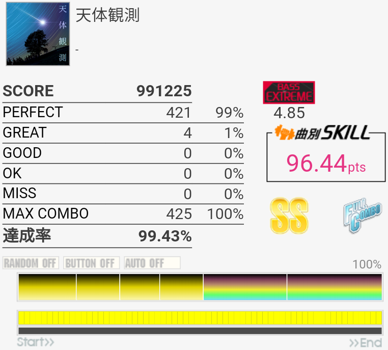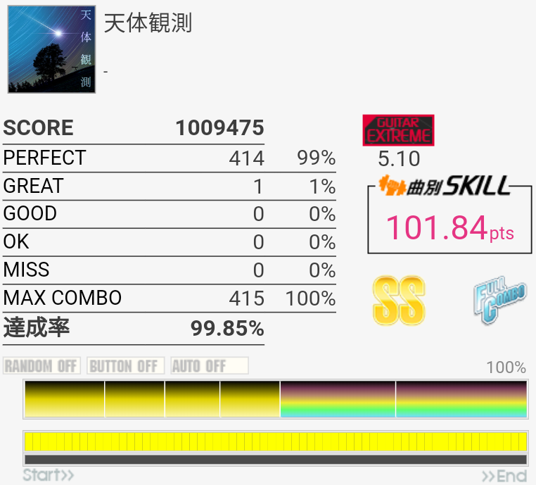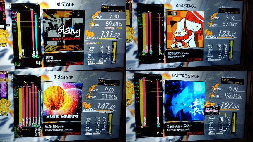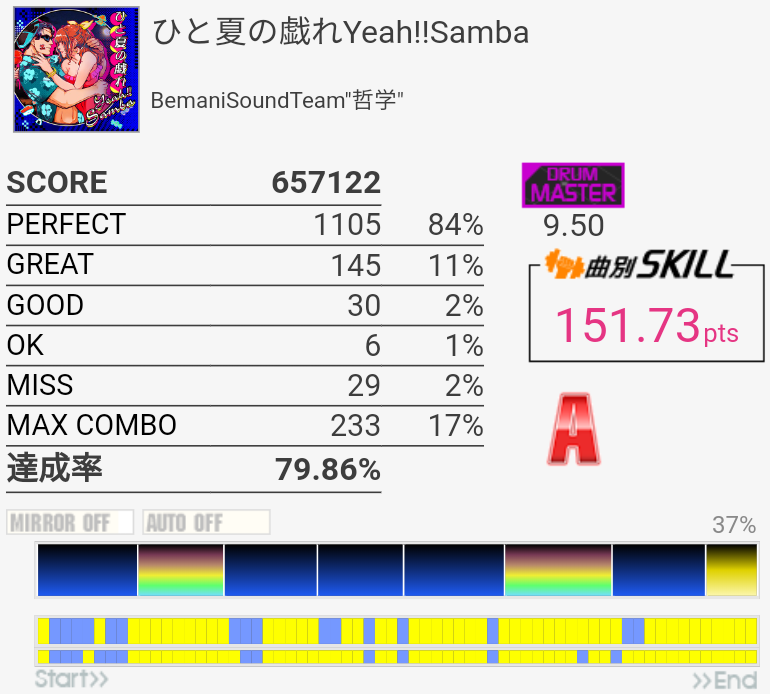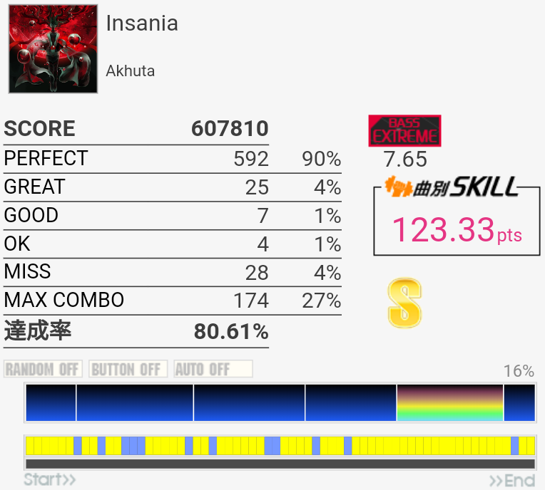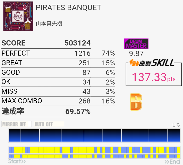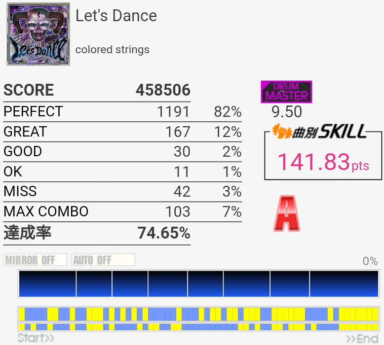 確認の成果があったのかちょっと伸びた。でも4フレーズ目は全然叩けない、考えて手が動かなくなっちゃうやつ。相変わらずパフェ率も低い。