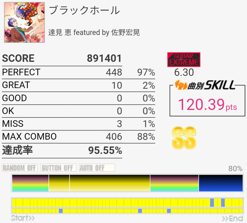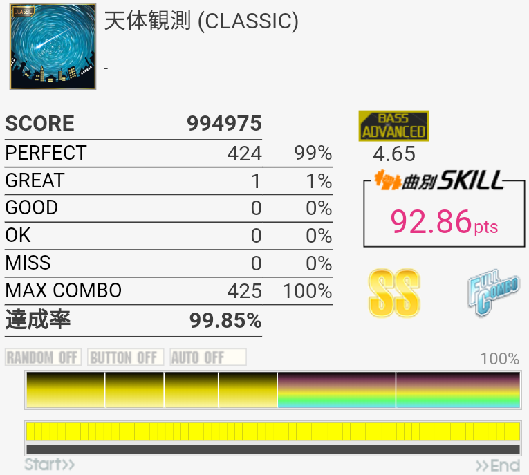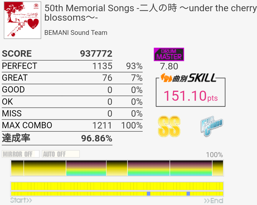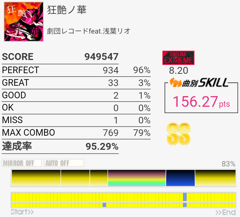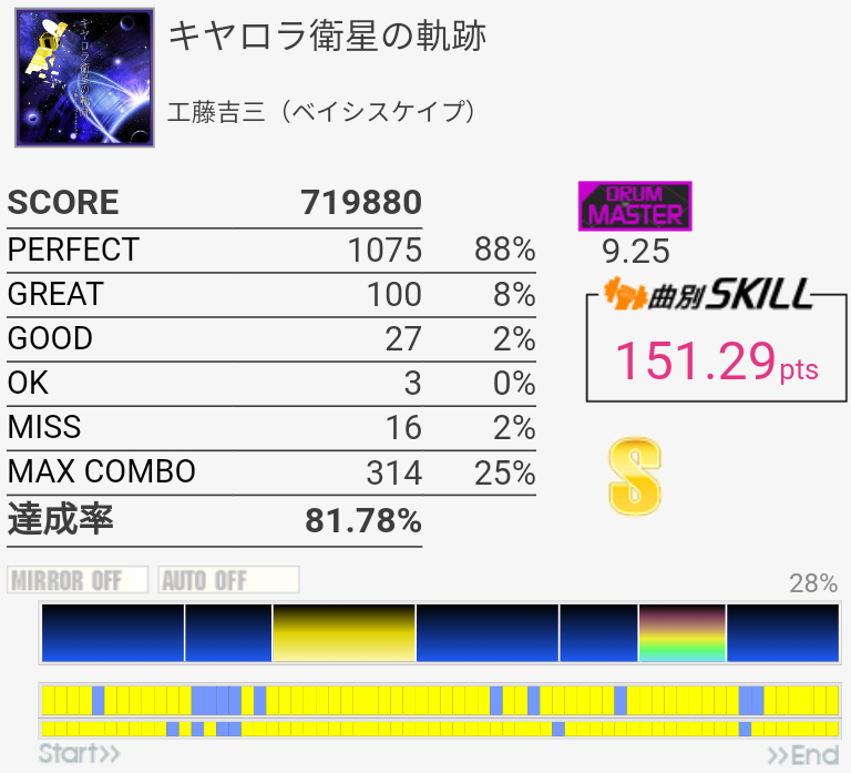 SS取得。なんかパフェ率よかった。5フレーズ目のタムはなんだかんだゴリ押しできそうだったな。