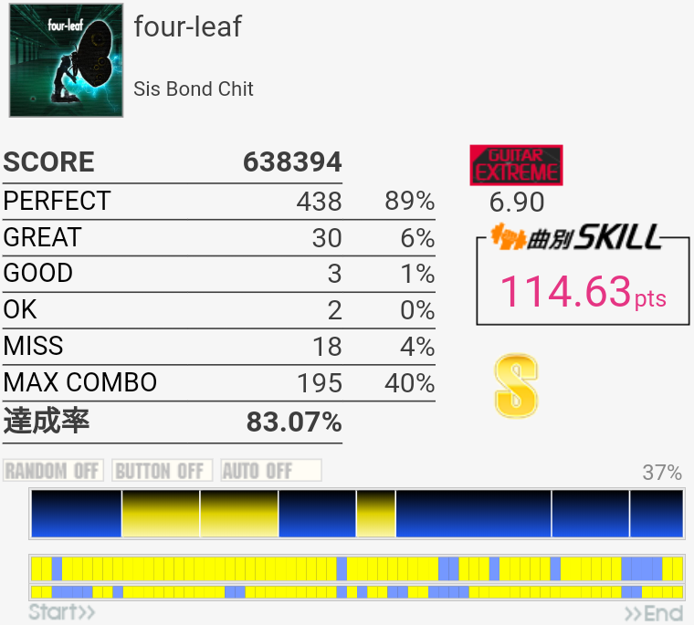 なんか2フレーズ目がまぐれ繋がりしてびっくりした。最初と最後のフレーズを取れていれば対象入りしたのでは?4フレーズ目の最後の連打は繋げたいなあ。