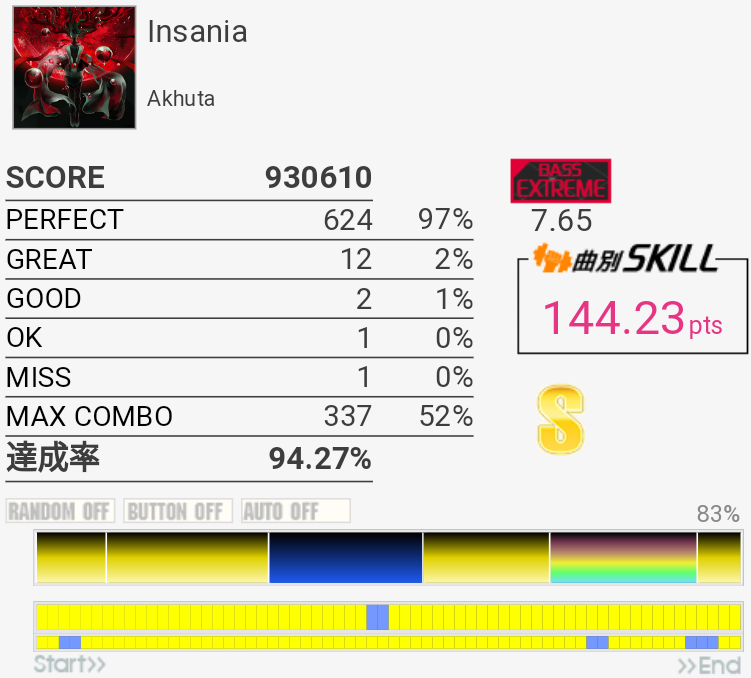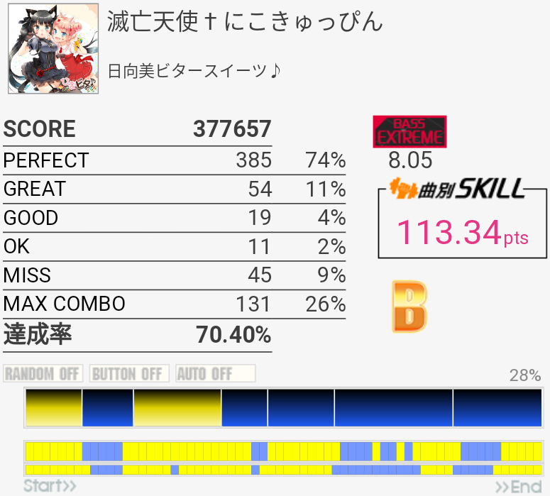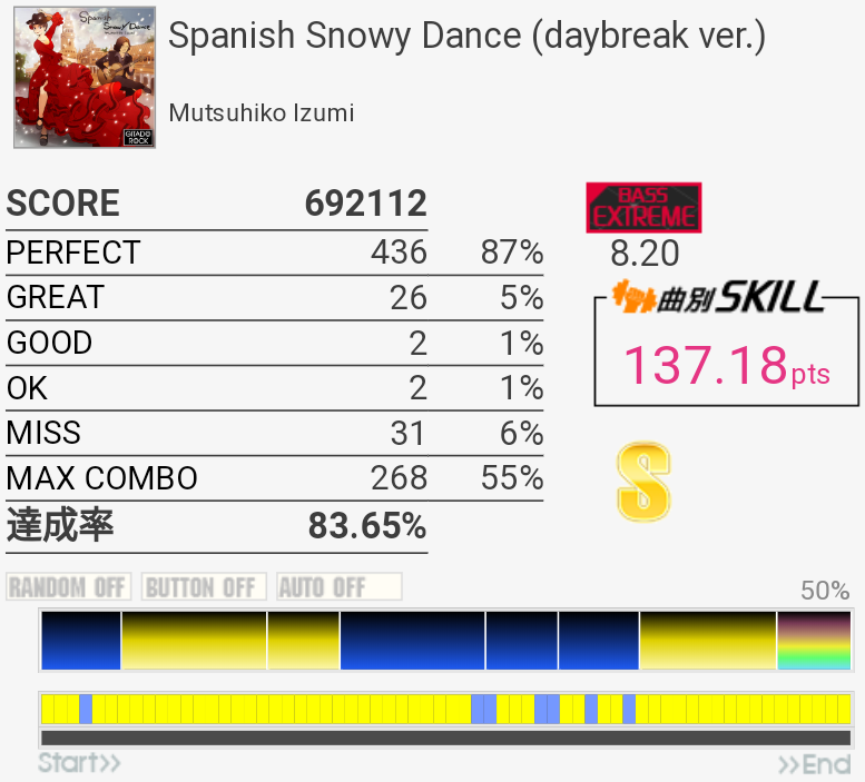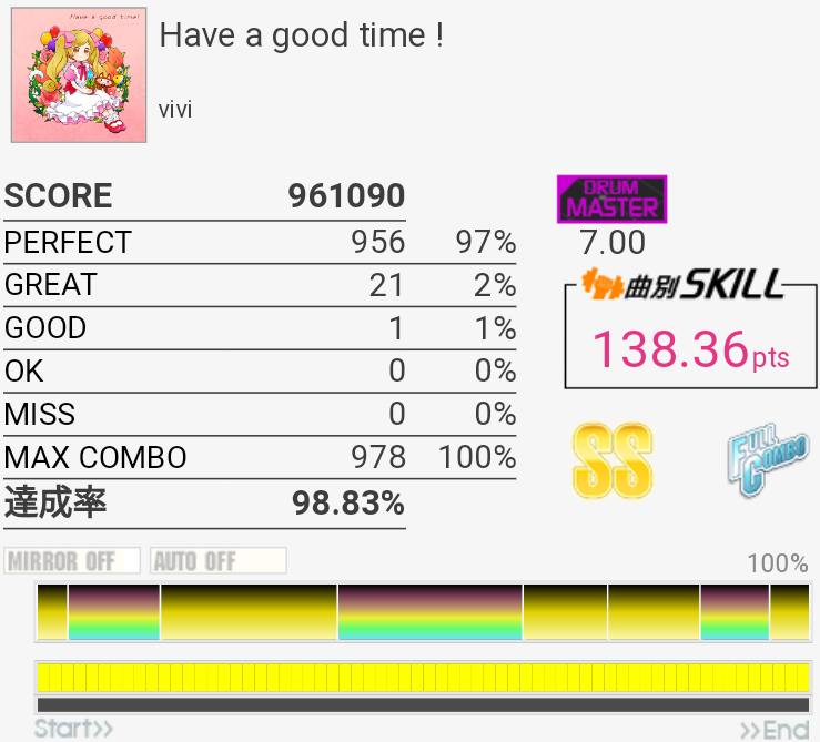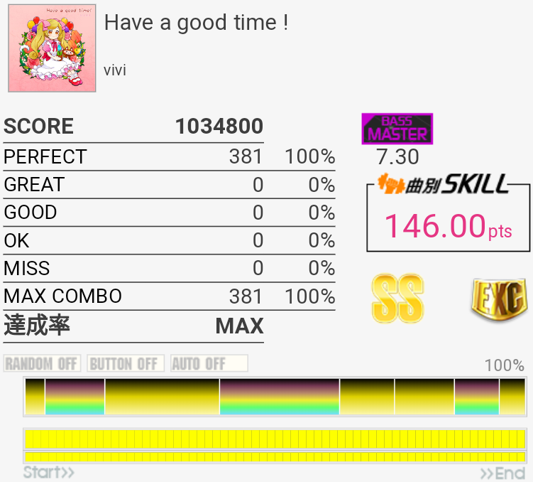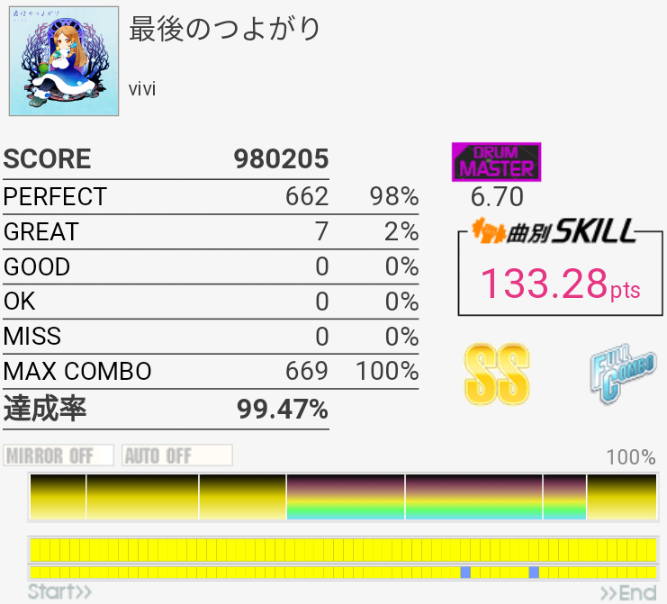 まさかのvivi新曲が二曲……!こちらは明るい曲、Longで聴きたいなあ。譜面は16分HHの場所を覚えるくらいか。なんとか初見で反応できた。