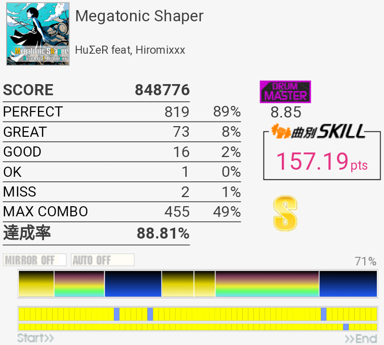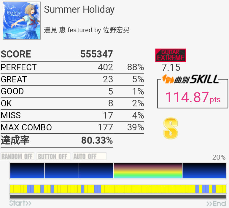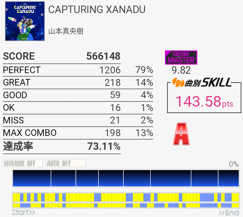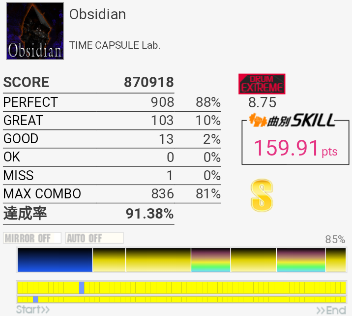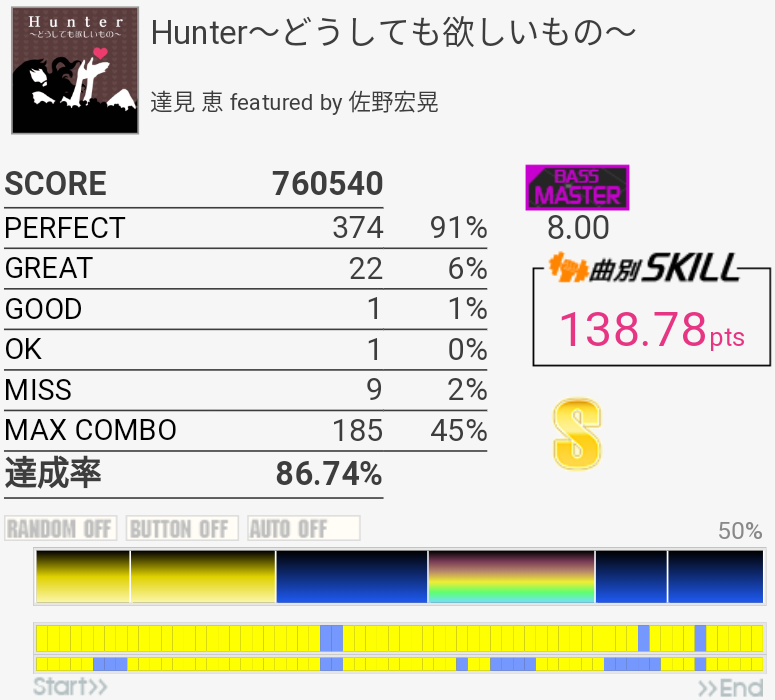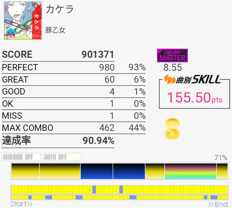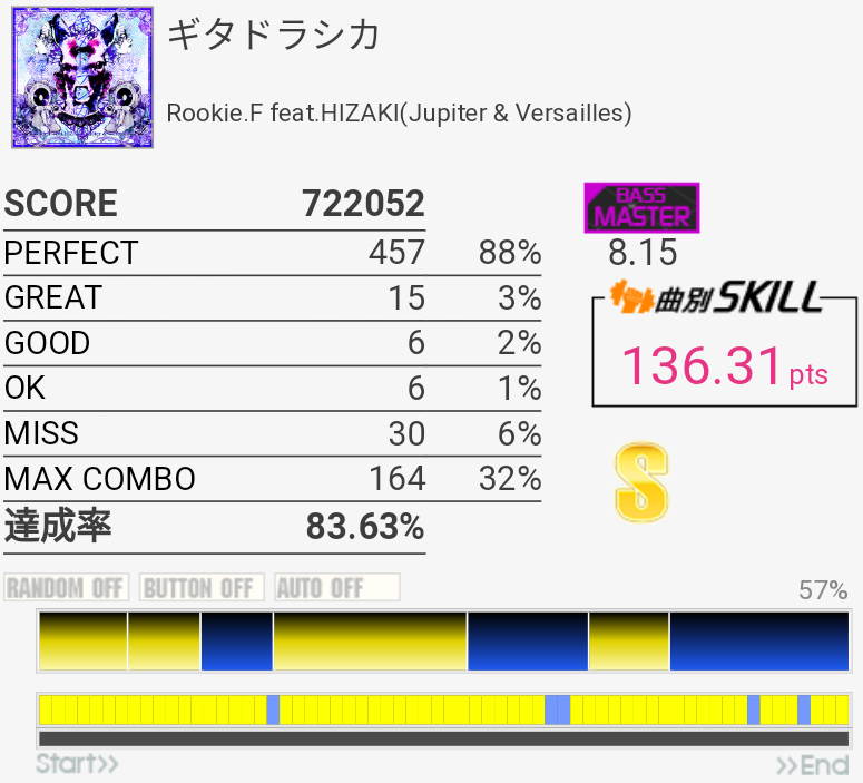 パフェ率は置いておいて、こういうのも前に比べてだいぶできるようになったなあ。フレーズごとに1ミスしているので伸びしろはありそうだけれど。