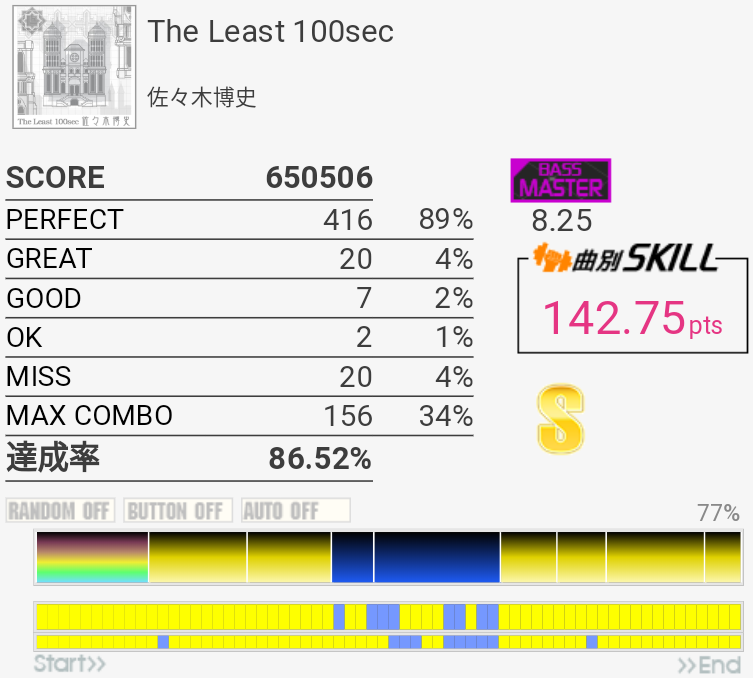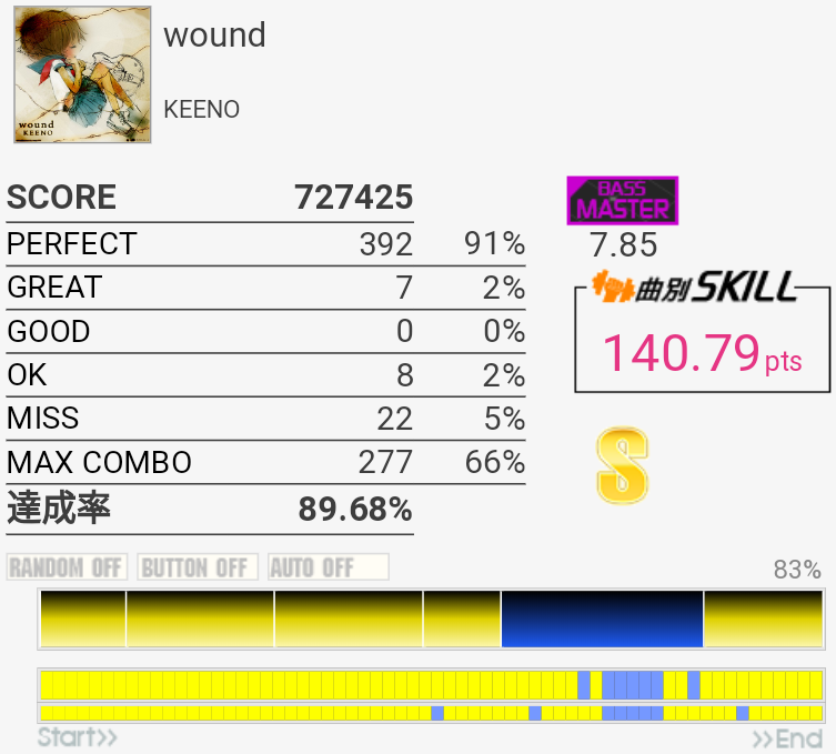 パフェ率低いけれど久々におしかった。SN×2→LT×2→FT×2の形は自分の場合上半身が右に流れてしまうのでLCに戻る時と同じ感じで左に引っ張ると比較的うまくいく……かもしれない。いつもの筐体でやってみないとわからない。