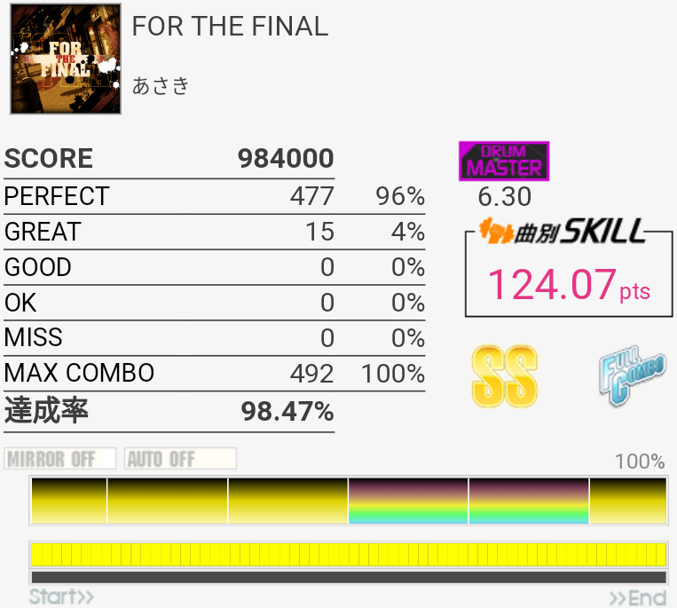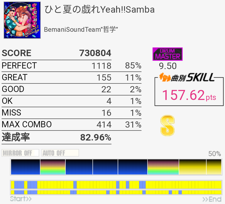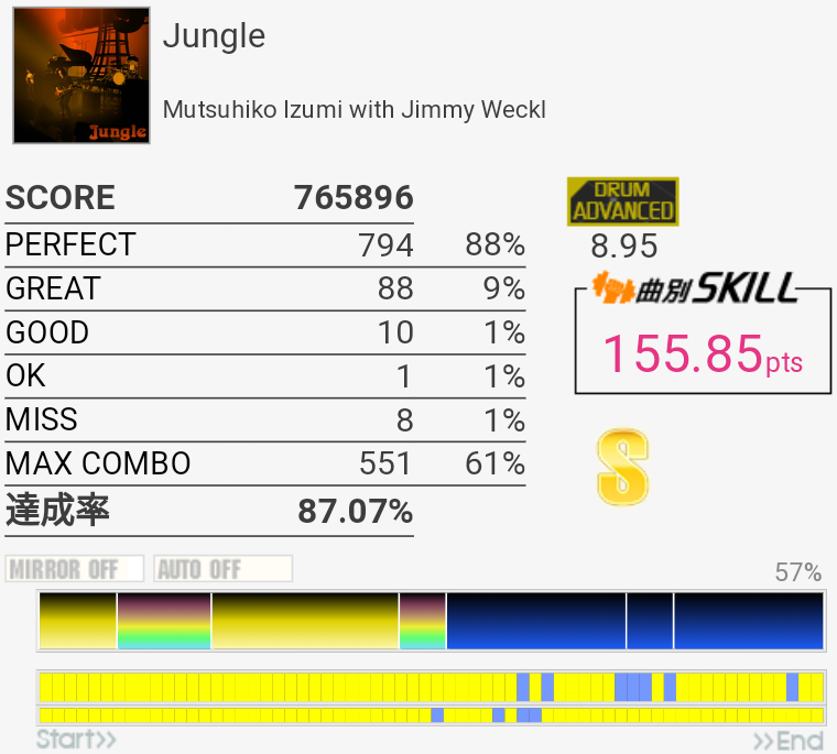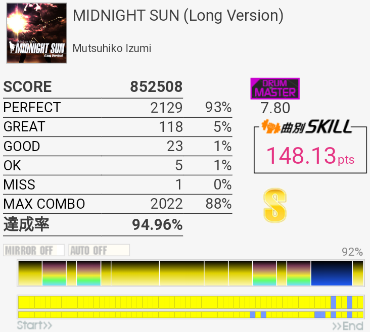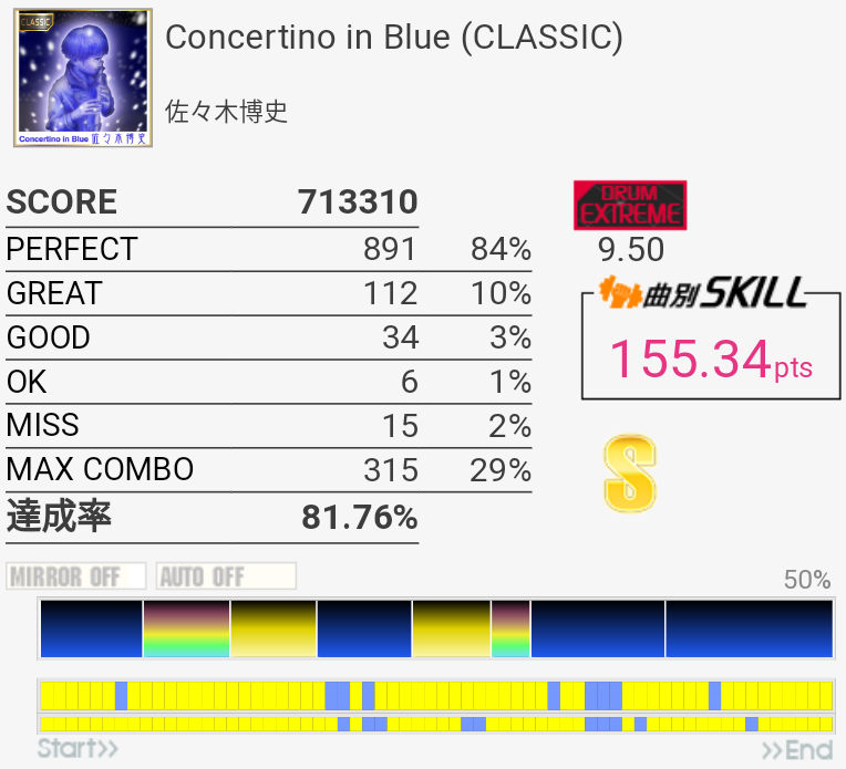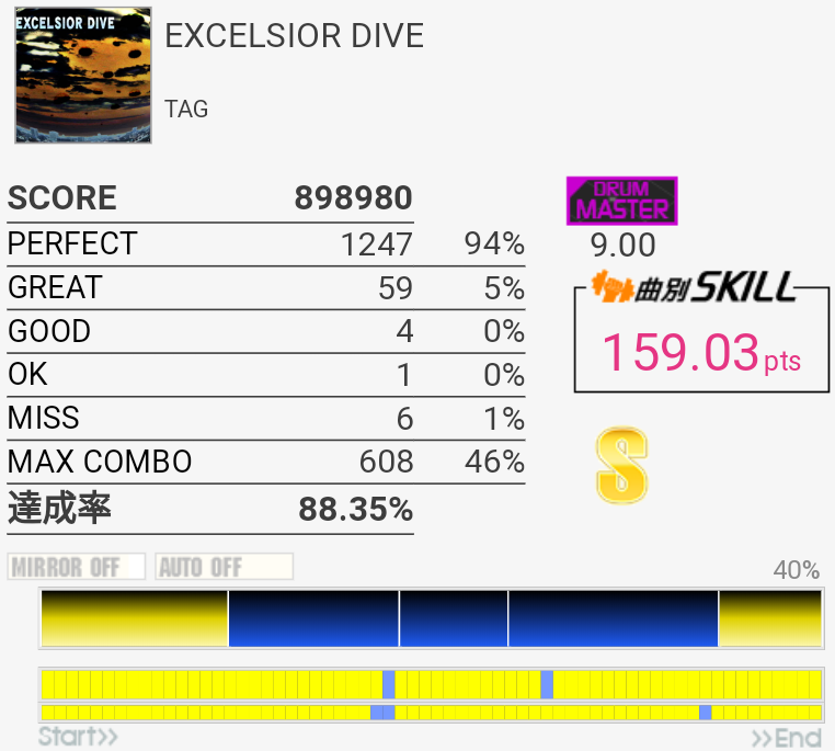 クッソ。全体的にBPでGREATを出しまくっていたのでSSに届かなかった。タム回しがそれなりに速いので油断すると切りそう、ラストのクソ速SN連打やらなんやらまでにパフェ率をいかに落とさないか……叩いてて気持ちいいんだけどね。