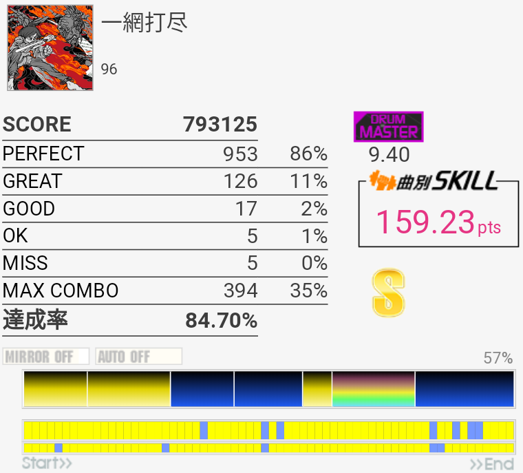 ちょい伸び。3フレーズ目がいつもよりは叩けたので160点を狙いたいところ。32分連打追い付かねえ。