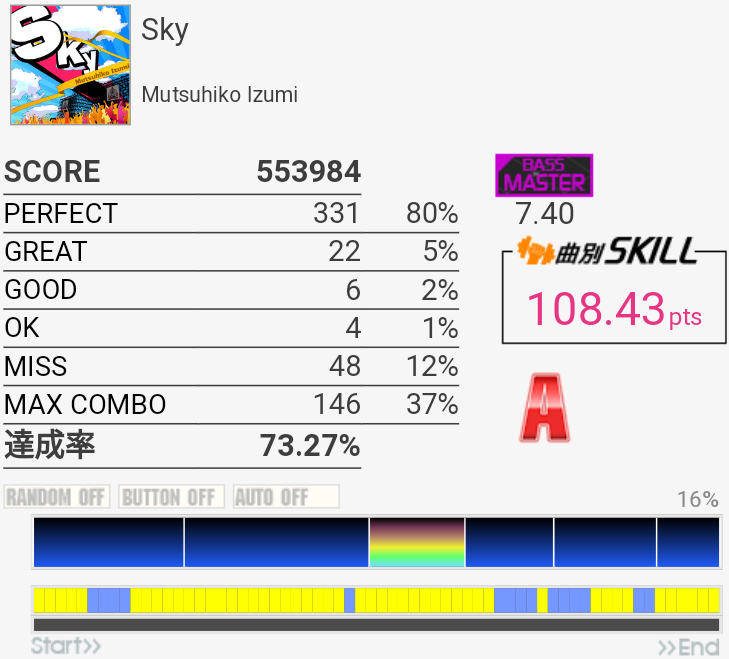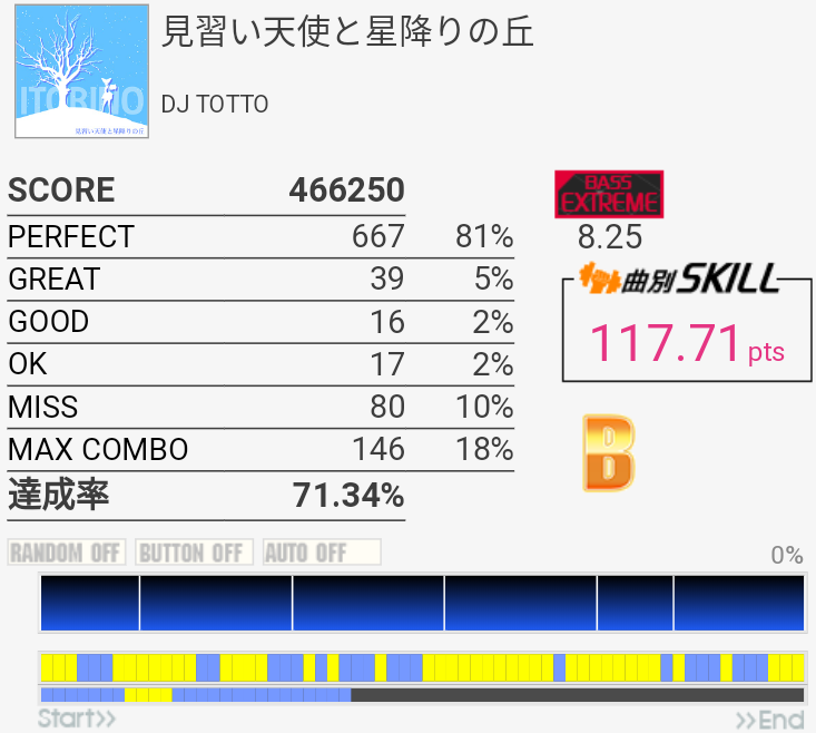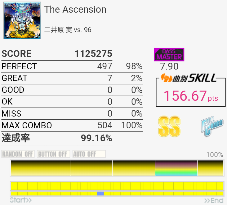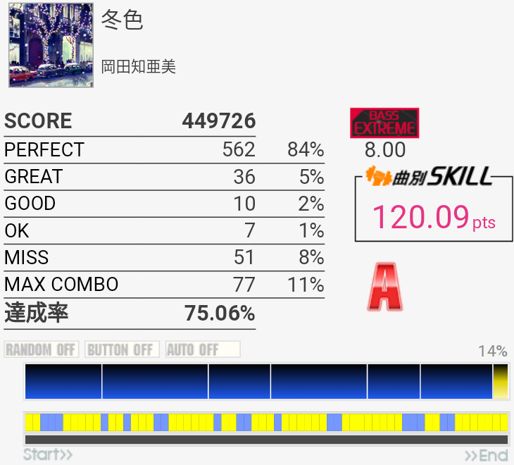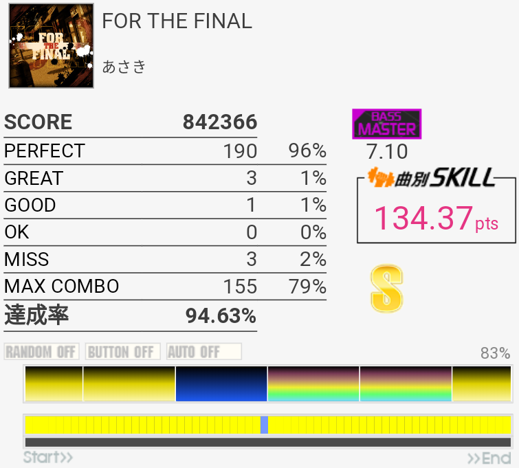 ゴリ押しがない譜面なのでもうちょい伸ばしたいところ。3フレーズ目のBP連打からのHT→FT→LCだったかの部分で切るようになってしまった。