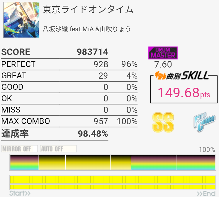 ノリがいい曲、譜面も素直でいい感じ。サビ終盤のフィルだけちょっと認識しづらいけれど6.60くらいだよね。