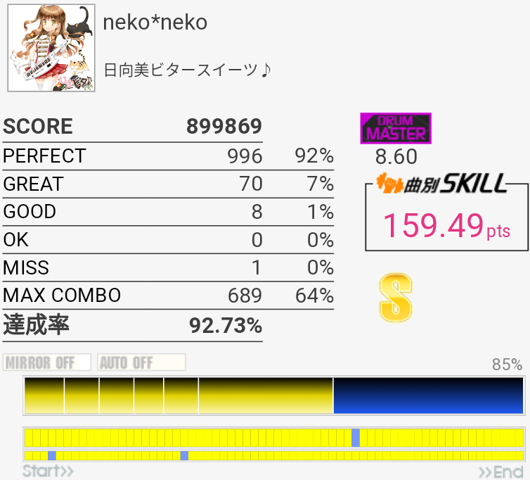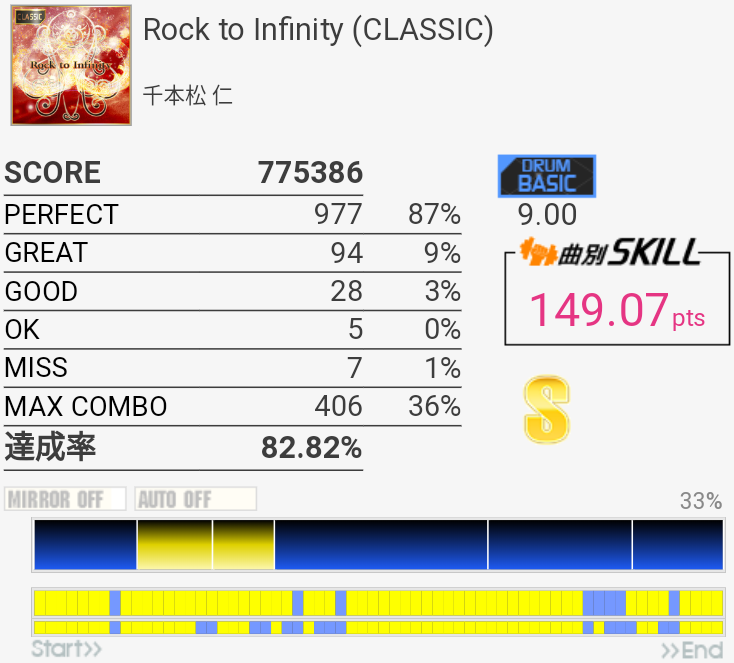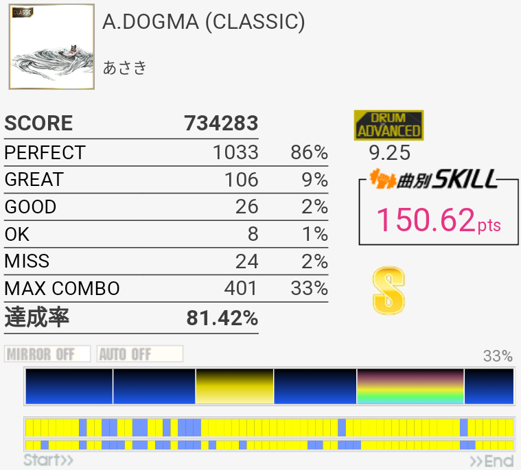 S取得。やっぱぜんぜん叩き方わからないや。Infinity STAGE進出を動画に収めたくてA.DOGMAをがんばったけれど、今日は95%が限界だった。どうやって97%出したんだろ。