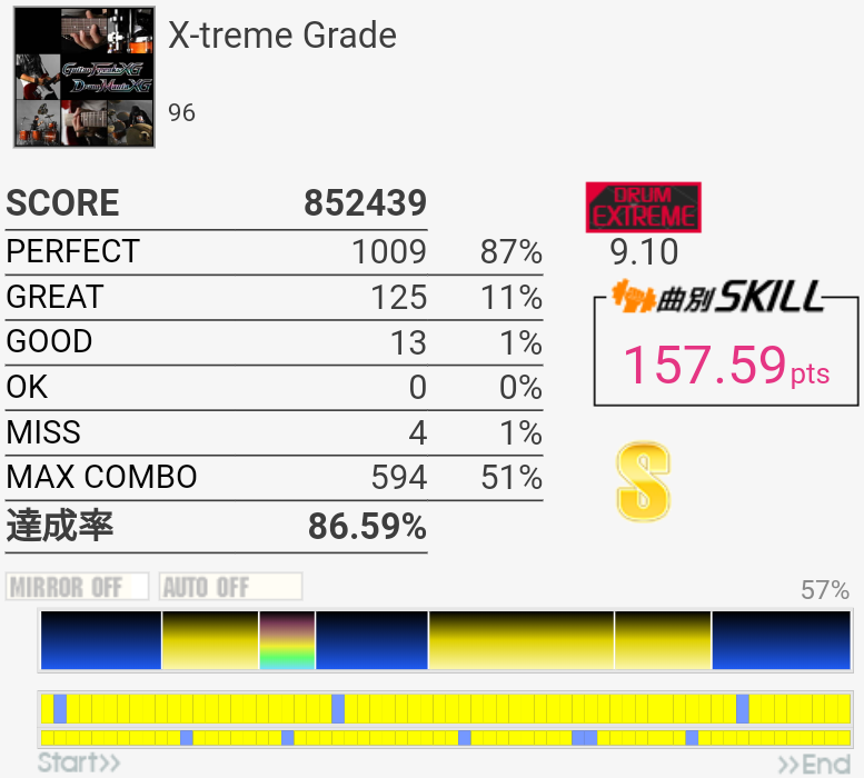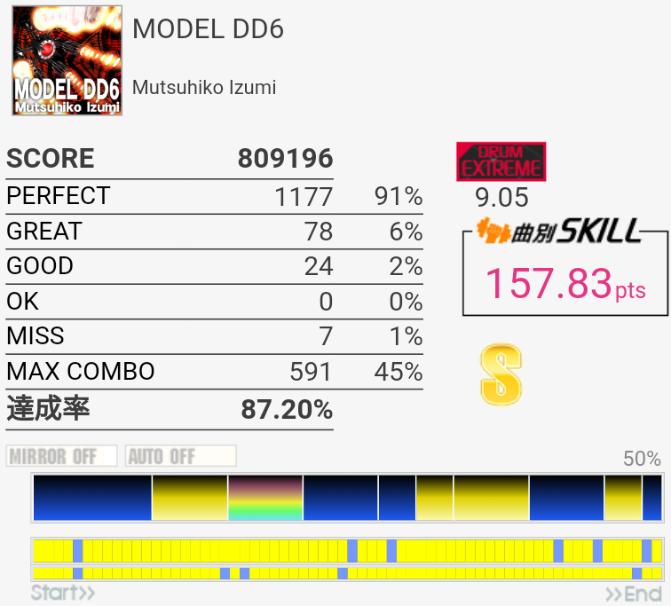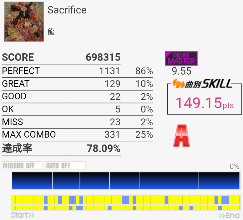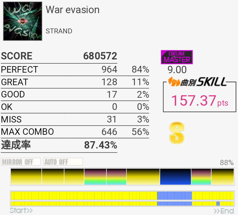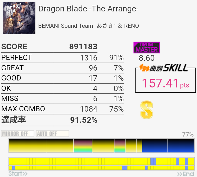 ドラブレアレンジとは、意表を突かれた。リアルタイムでやってた人は特にうれしいだろうなー。譜面はあさきっぽくも無理なフィルがなくて、伸ばすために回数やるのも苦痛じゃない。後半の不等長FT×4→16分三連符SN×3→HT×3→SNの部分が最大の切りどころだろうか、一回だけ繋がったけれど難しい。あと真ん中らへんにもよくわからない手と足の絡みがあった気がするな、何回もやっていたらそこで絶対切るようになってしまった。終盤のツーバスも始動で癖がつくと悲惨。難しい。