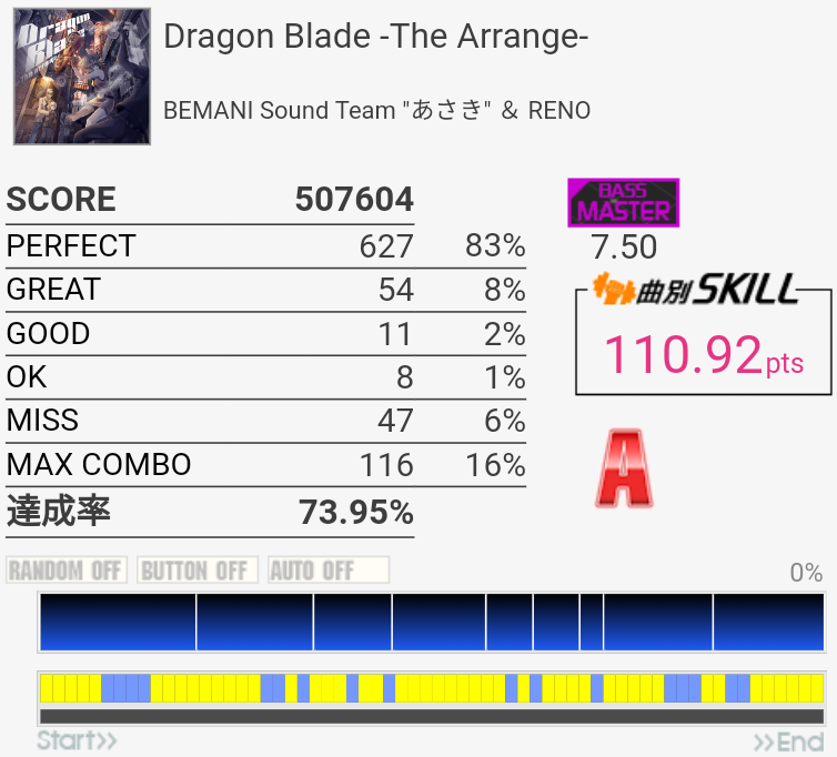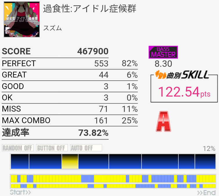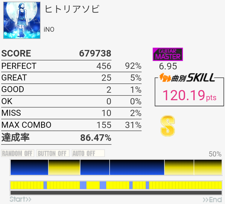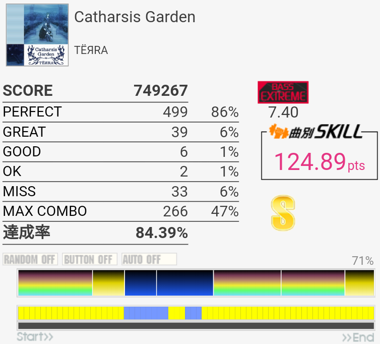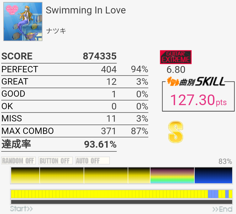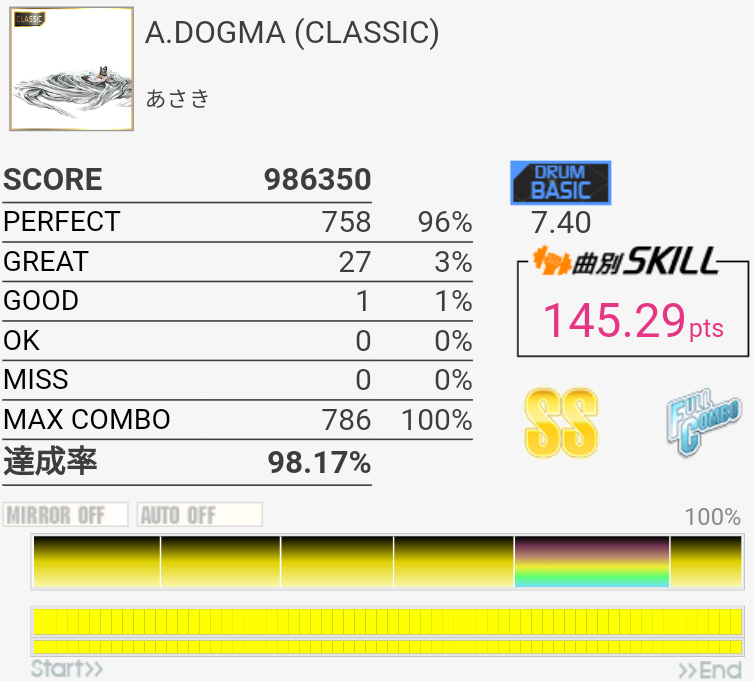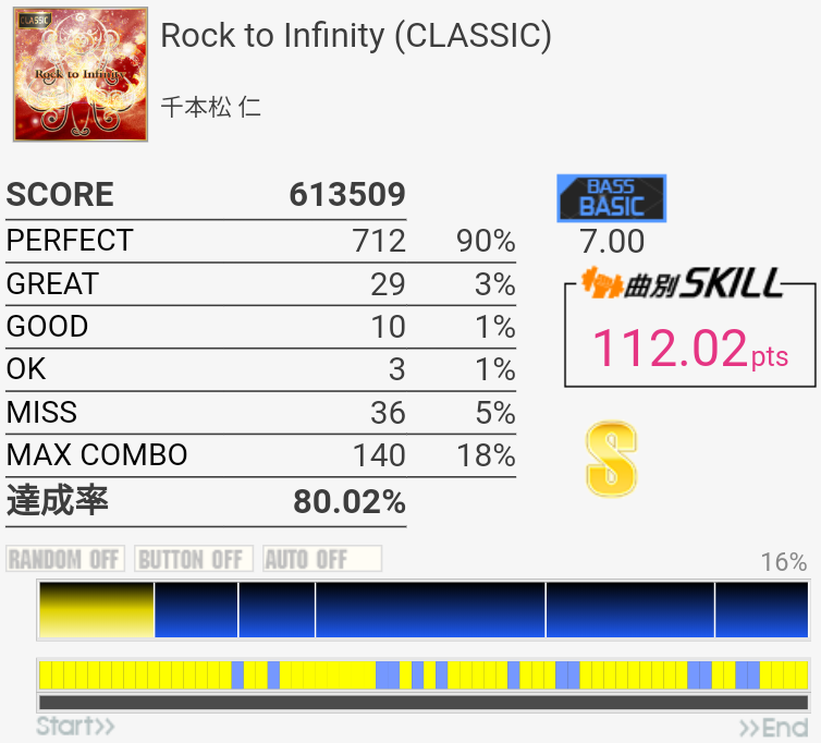 パフェ率96%でINFINITY STAGEに進出できたという報告を何件か見かけたけれど行けなかった。内部的に繰り上がって97%になることがある、とかそんな感じだろうか。PERFECTが762個の時とか?2フレーズ目でどうしてもGREATとGOOD出しちゃうんだよなあ。