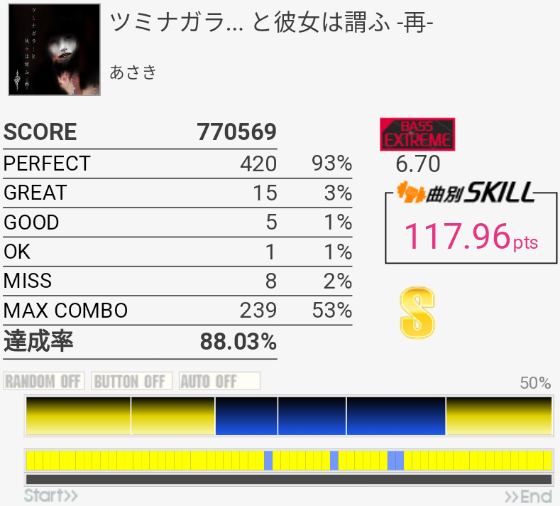 原曲より譜面自体はやさしい、高速SN連打さえしっかり叩ければ。何回もやっていると裏バスが踏めなくなってくる……。