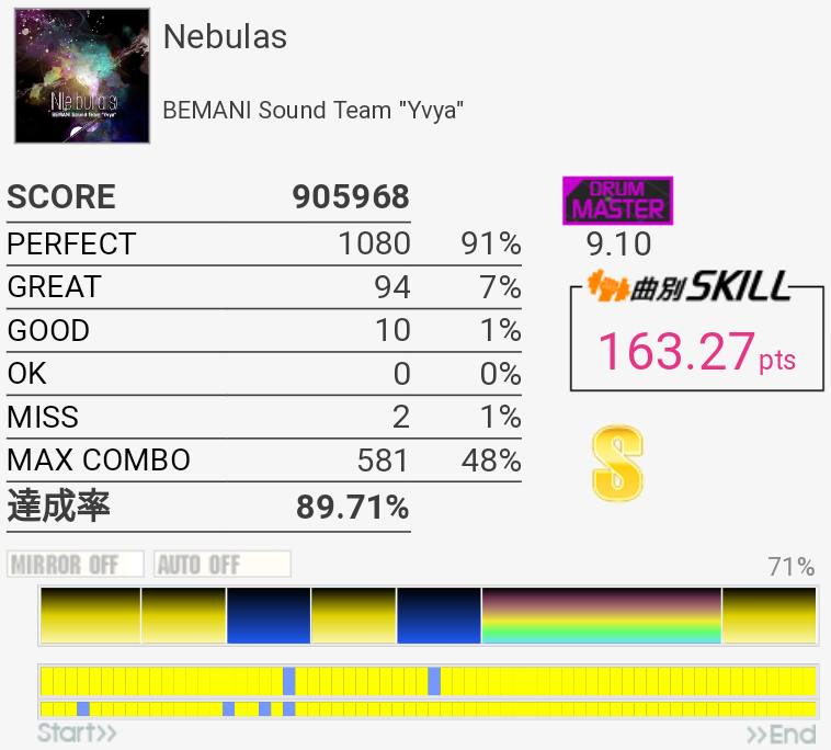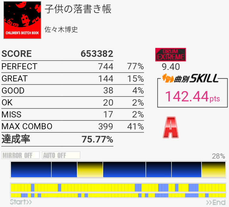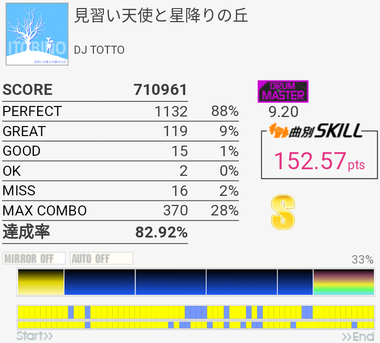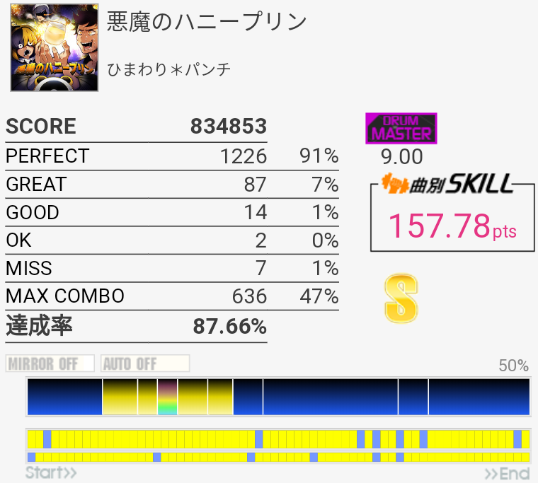 惜しい。5フレーズ目のHT→SN×2は毎回左で入っちゃって叩けないのよな。二度とこんなに繋がらない気がする。