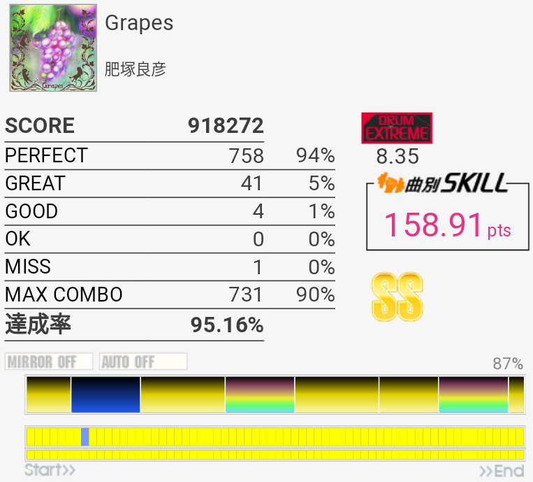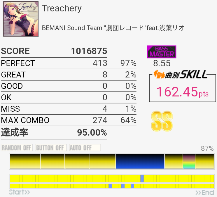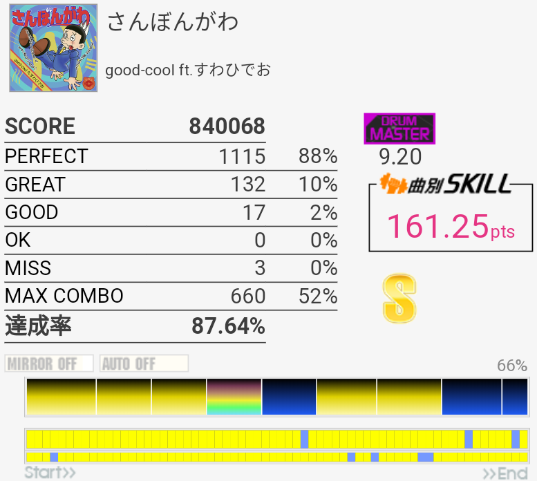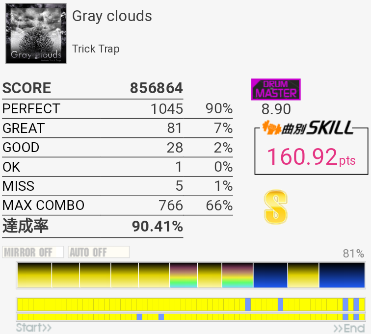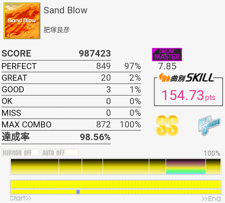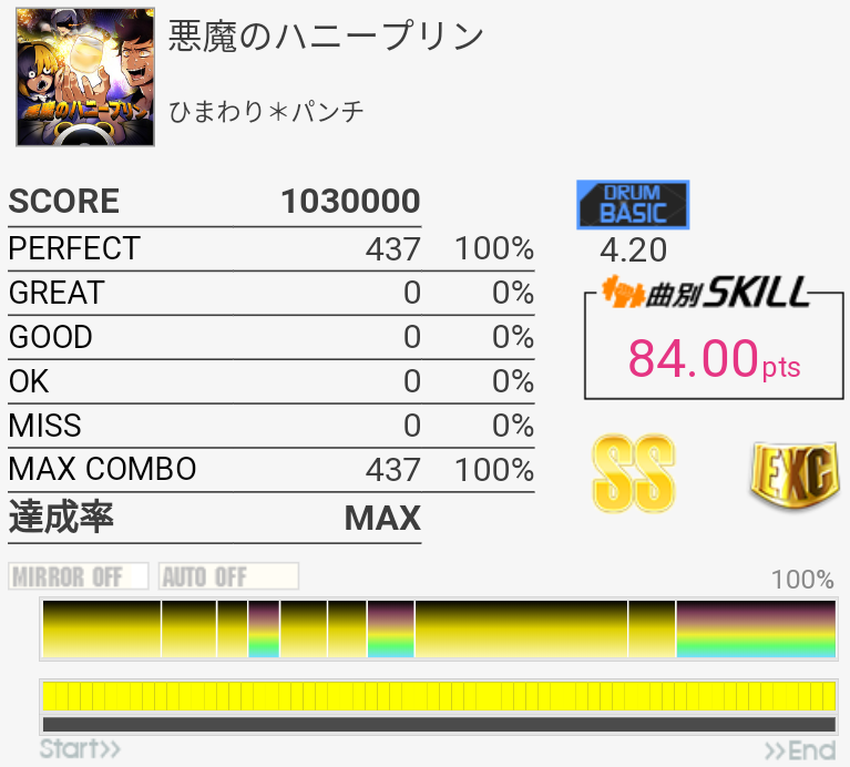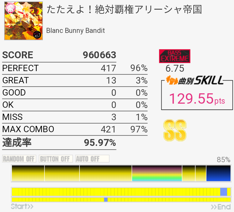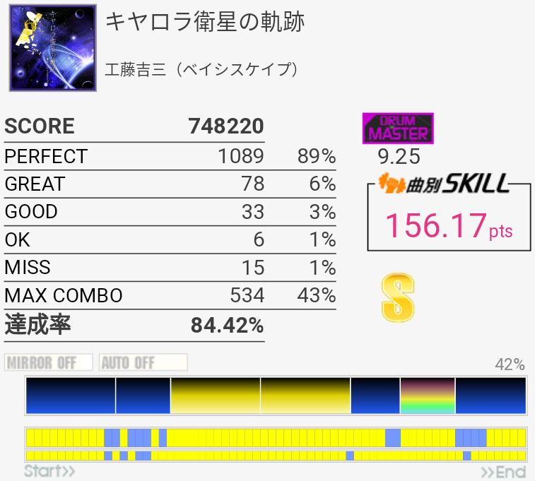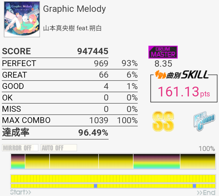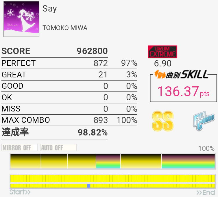 SS取得。パフェ率がいつもより高くて助かった。普段はフルコンしてもSS乗らないくらいだからな……。