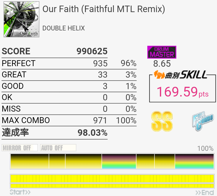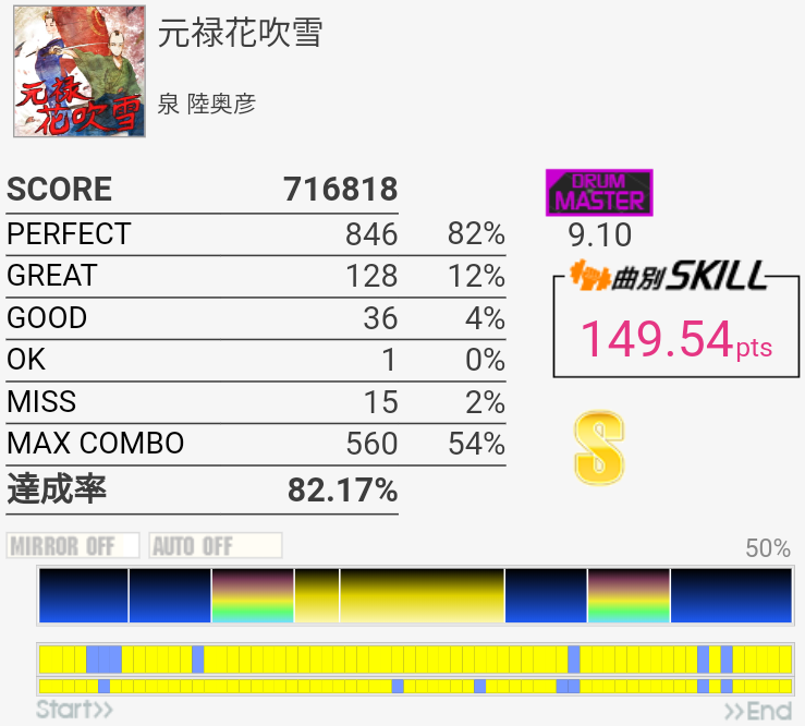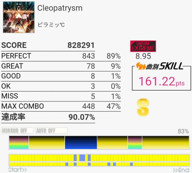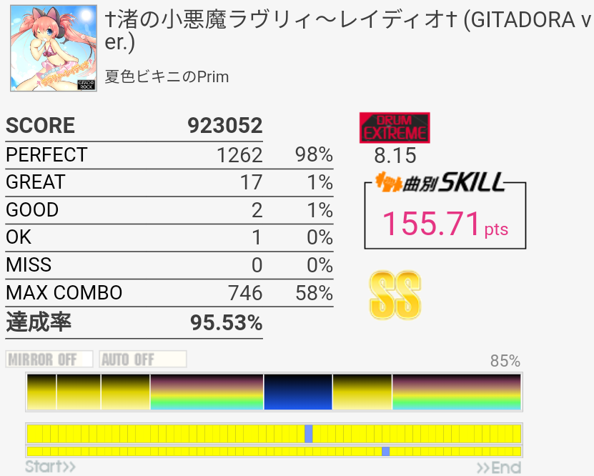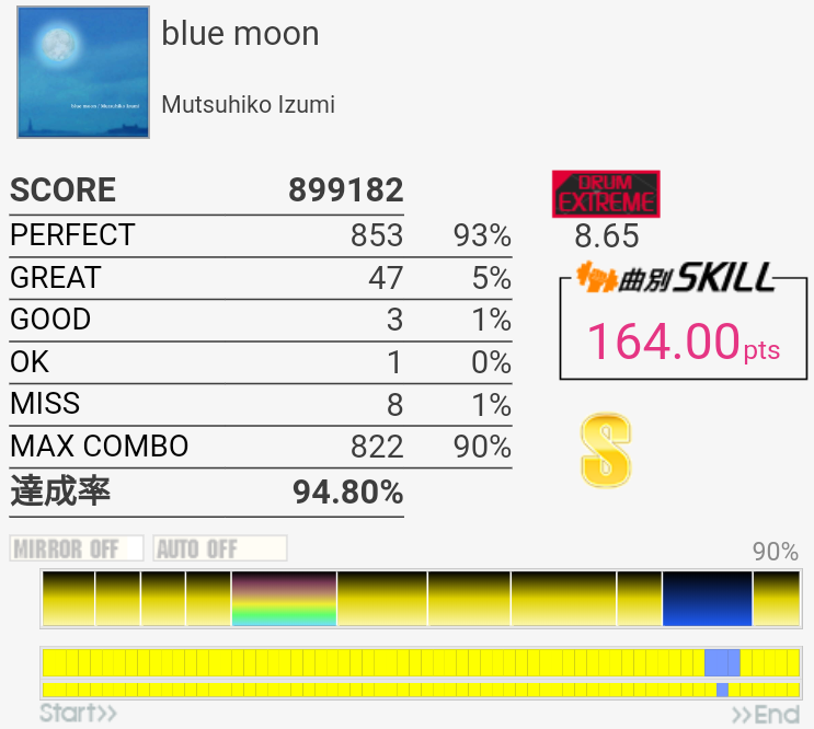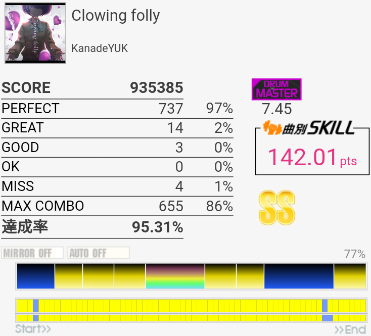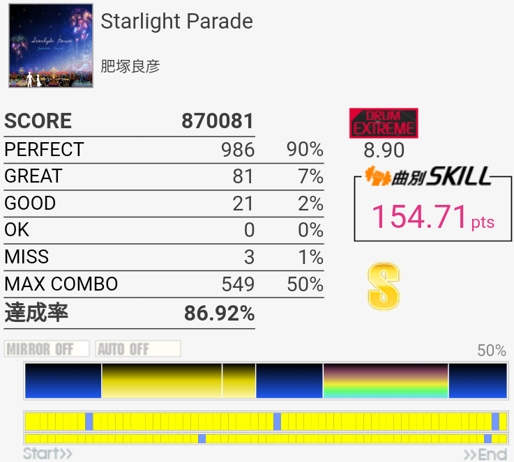 久しぶりに選んでみたらまさかの1ミス……SPフレーズくらいから緊張してかなり走っていたのでパフェ率が悲惨なことになって対象には入らなかった。繋げってことだな。