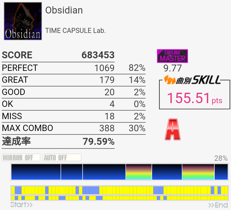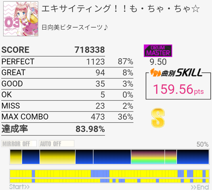 これも繋いでからやっていなかったけれど久しぶりにやったらまた繋がって微更新。どうでもいいところでパフェ率を落としていたので170点乗せたいなあ。