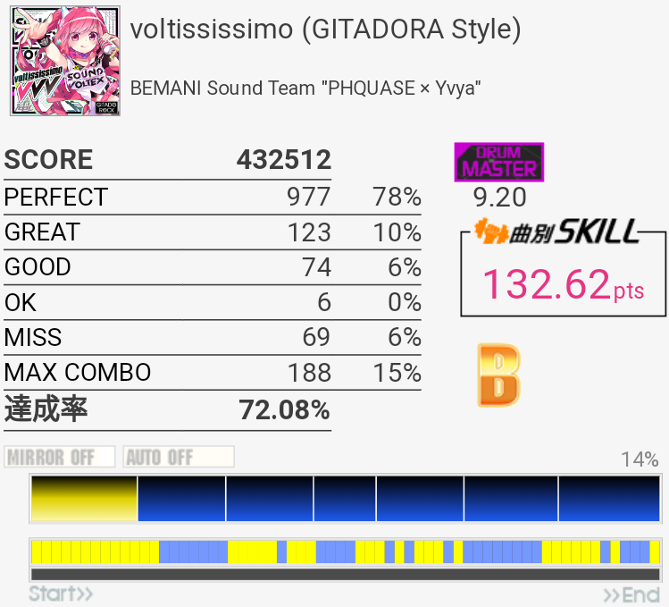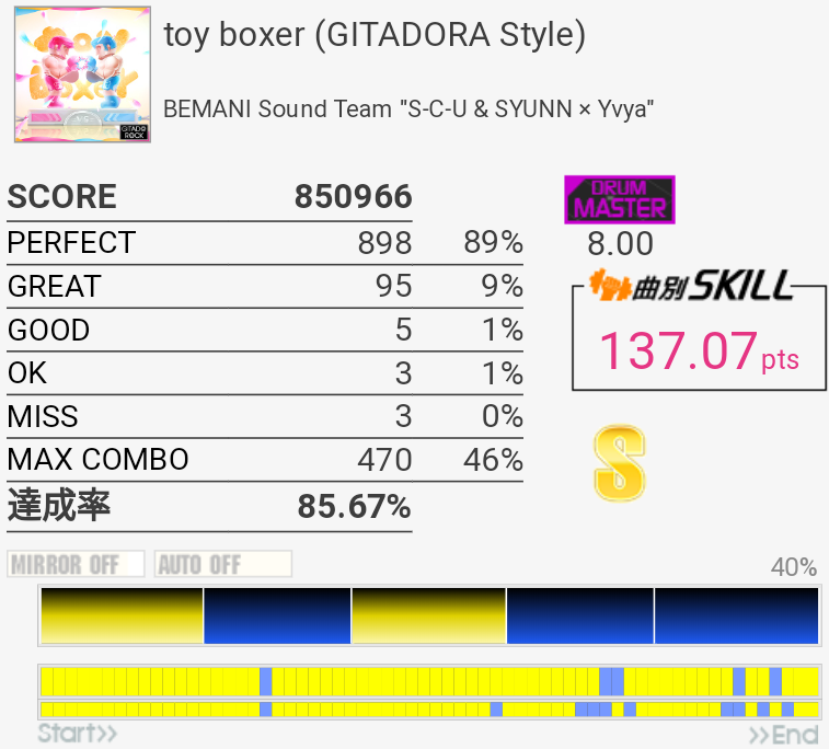 三連符タムがダメ。やっぱりLTに移るときに左手がちゃんと動かなくて叩けない。でもHot枠トップ。