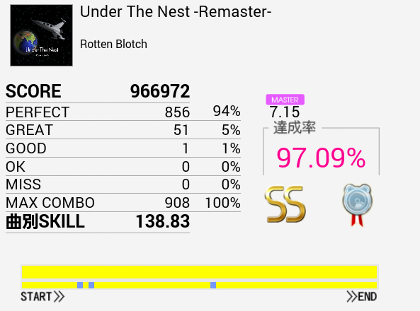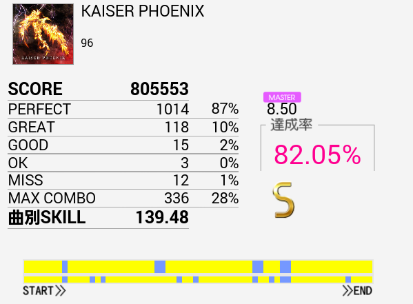 今までで一番いいスコア。序盤の6連ツーバスとか中盤の三連CYとかが苦手。